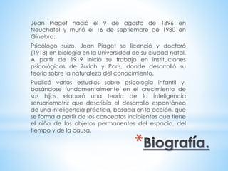 Jean Piaget, psicólogo suizo, desarrolló una teoría del desarrollo cognitivo infantil que describe cuatro etapas clave (sensoriomotora, preoperacional, operaciones concretas y operaciones formales) y cómo los niños adquieren y complejizan su comprensión del mundo a través de la interacción física y conceptual. Su teoría aún influye en el estudio del aprendizaje y el desarrollo infantil.