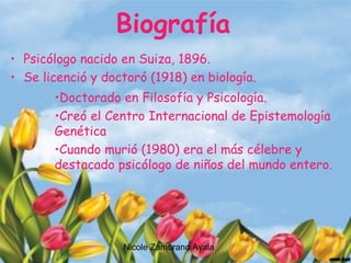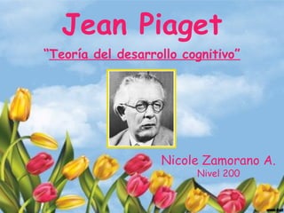 Jean Piaget fue un psicólogo suizo que desarrolló la teoría del desarrollo cognitivo. Su teoría se basa en estudios sobre el desarrollo del conocimiento en los niños y establece 4 etapas principales: la etapa sensoriomotora, la etapa preoperacional, la etapa de las operaciones concretas y la etapa de las operaciones formales. Piaget también propuso que existen diferentes tipos de conocimiento como el físico, lógico-matemático y social.