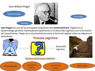 Jean Piaget fue un epistemólogo e psicólogo suizo que propulsó el constructivismo. Creía que el conocimiento se construye a través de la interacción con el entorno y que factores como la maduración, la experiencia activa y la interacción social contribuyen al desarrollo cognitivo. Jerome Bruner y Noam Chomsky sugirieron que el lenguaje y la experiencia previa están relacionados con el desarrollo de nuevas estructuras mentales. Para Bruner, el constructivismo provee un marco general sobre la instrucción basado en