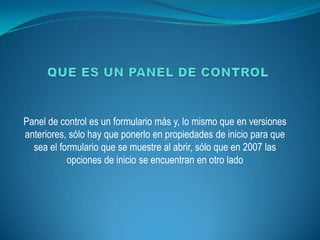 Este documento explica cómo crear un panel de control en Access para organizar y acceder fácilmente a los diferentes formularios, informes y opciones de una base de datos. Se utiliza el asistente del administrador de paneles de control para agregar enlaces a formularios como búsqueda de datos, entrada de datos, etiquetas e informes. Luego, cada enlace se asocia al formulario correspondiente para que el usuario pueda acceder a ellos desde el panel de control principal.