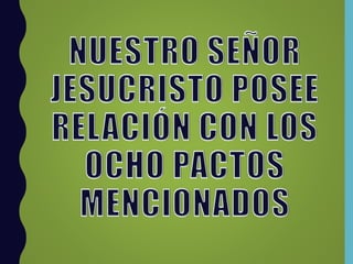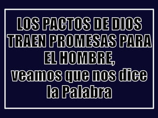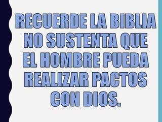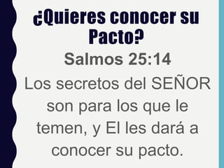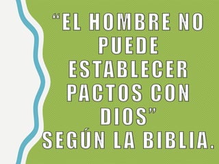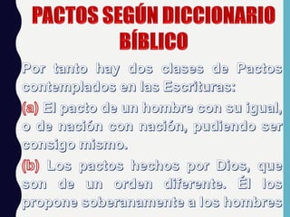 El documento explora el concepto de pacto en la Biblia, analizando diferentes tipos de pactos que Dios estableció con la humanidad a lo largo de las escrituras. Se refiere a los pactos desde Génesis, incluyendo el pacto con Noé, Abraham, Moisés y el nuevo pacto en Jesús, así como la distinción entre pactos y juramentos. También se menciona el peligro de hacer pactos con fuerzas contrarias a Dios, como simboliza el pacto con Baal-berit.