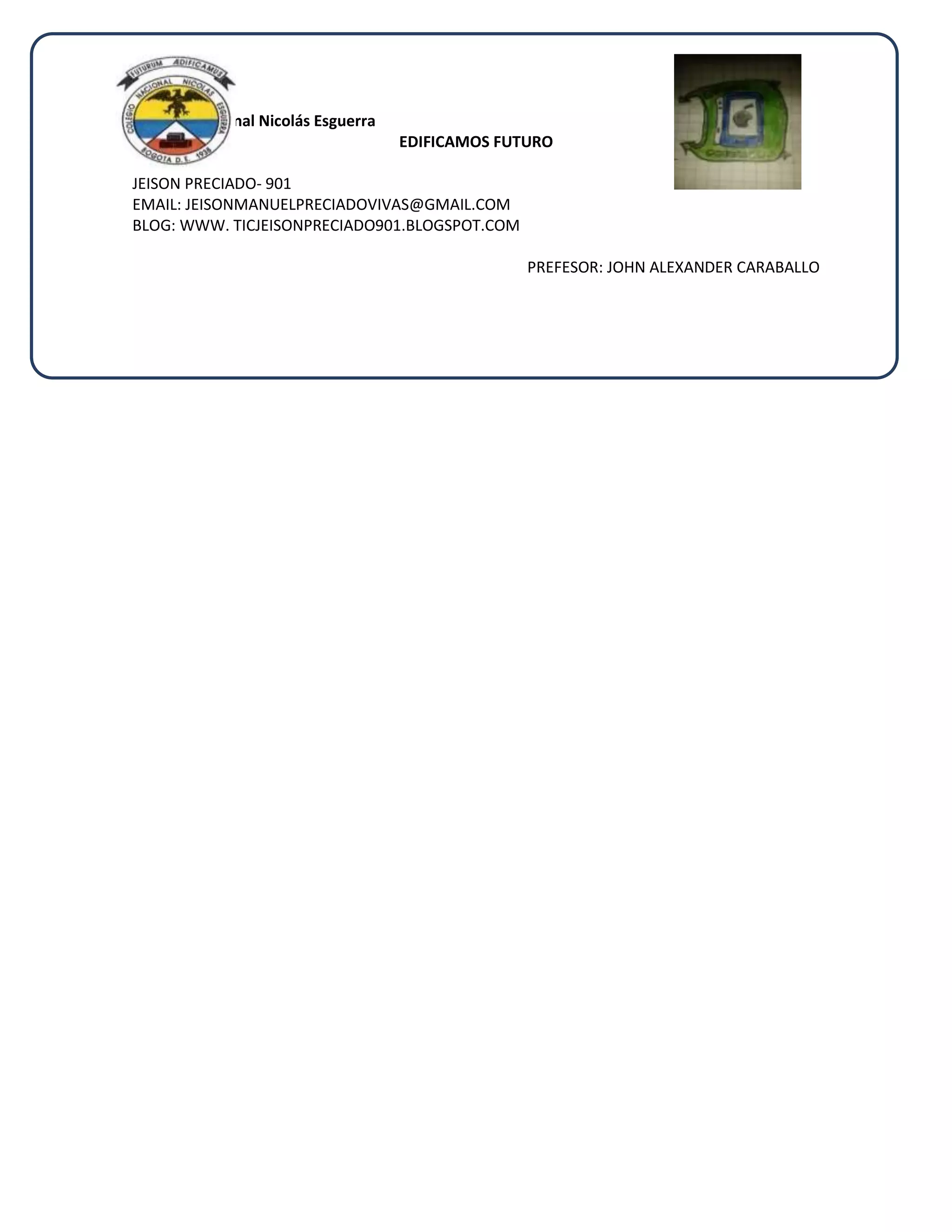 El documento presenta información sobre un estudiante del Colegio Nacional Nicolás Esguerra. Jeison Preciado es el estudiante con número 901 que comparte su correo electrónico y blog. El profesor a cargo es John Alexander Caraballo.