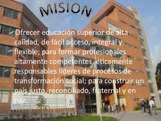 El documento describe la misión de ofrecer una educación superior de alta calidad y accesible para formar líderes éticos que promuevan la transformación social hacia una sociedad justa, reconciliada y en paz. También busca ser líder en metodologías de educación a distancia articuladas con otros niveles educativos para satisfacer las necesidades cambiantes. El Consejo de Fundadores es responsable de aprobar, reformar, promulgar e interpretar los reglamentos internos de la institución. Según las reglas de los profesores, una falta b