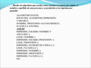 El documento presenta tres algoritmos propuestos como ejercicios. El primero pide los datos de nombre, profesión y cédula de una persona e imprime la información. El segundo pide dos números enteros y calcula y muestra la suma, resta, multiplicación y división. El tercero calcula el salario de un trabajador en base a sus horas trabajadas y tarifa por hora, con tarifa mayor para horas extras.