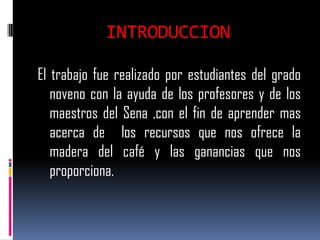 Este documento describe un proyecto realizado por estudiantes de noveno grado para aprender más sobre el cultivo del café y aprovechar la madera de los tallos del café. El proyecto tiene como objetivo construir muebles de madera de café para generar ingresos adicionales mientras las plantas vuelven a producir luego de ser podadas cada 8 años. El documento incluye secciones sobre la justificación, objetivos, marco teórico, cronograma, presupuesto, glosario y bibliografía del proyecto.