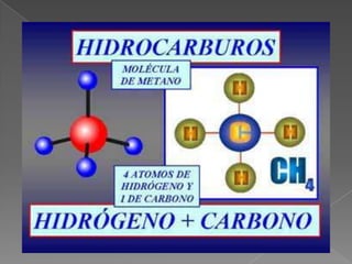 Los hidrocarburos son compuestos orgánicos formados por átomos de carbono e hidrógeno. Pueden ser alifáticos o aromáticos, y se clasifican según su estructura molecular y los enlaces entre átomos de carbono. El petróleo y el gas natural son hidrocarburos de gran importancia económica que se extraen comercialmente y son combustibles fósiles ampliamente utilizados. La explotación petrolera en Ecuador comenzó en 1924 y ha tenido un papel importante en su economía.