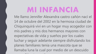 Jennifer tuvo una infancia feliz con sus padres y hermanos en Chiquinquirá, pero cuando entró al jardín le costó separarse de su madre. Más tarde disfrutó la primaria, donde hizo amigos y le gustó estudiar. Sin embargo, cuando sus padres se separaron en quinto grado, su madre dejó de prestarle tanta atención y sus calificaciones empeoraron. Actualmente, Jennifer sueña con terminar la universidad, cuidar a su madre y tener una familia feliz.