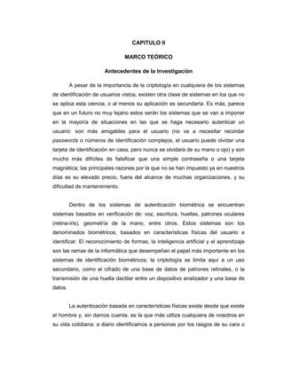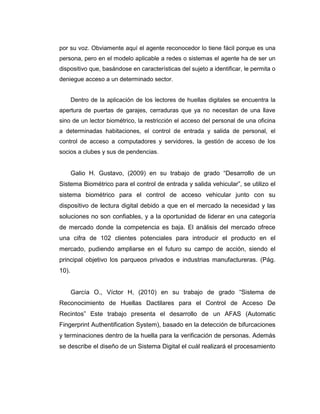 El documento habla sobre los sistemas de autenticación biométrica basados en características físicas como la voz, huellas digitales, iris y geometría de la mano. Estos sistemas son más amigables para el usuario y más difíciles de falsificar que contraseñas o tarjetas, aunque su adopción ha sido limitada debido a su alto costo. El documento también menciona algunos trabajos de grado relacionados con el desarrollo e implementación de sistemas de control de acceso basados en huellas digitales.