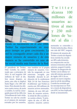 Un estudio encontró que los hombres son más propensos que las mujeres a compartir información personal y aceptar solicitudes de amistad de extraños en redes sociales como Facebook y Twitter. Las mujeres tienden a ser más cautelosas al configurar la privacidad de sus cuentas y evitar compartir su ubicación u otros detalles con desconocidos. El presidente de Twitter anunció que la red social ahora tiene 100 millones de usuarios activos mensuales y 250 millones de tweets diarios, y que la mitad de los usuarios acceden a Twitter todos los días.