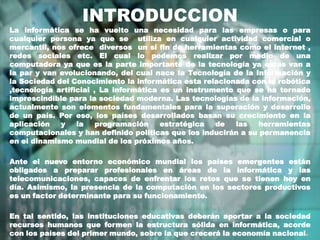 El documento trata sobre la informática y sus componentes. Explica que la informática es la ciencia que estudia la computación y los avances tecnológicos, y define los componentes clave de una computadora como la placa base, memoria RAM, CPU, hardware y software. También resume la evolución de la informática desde las primeras máquinas mecánicas hasta los computadores digitales modernos.