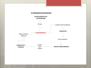 Jerome Bruner fue un psicólogo y pedagogo estadounidense que desarrolló una teoría del aprendizaje cognitivo. Según Bruner, el aprendizaje es un proceso activo donde los estudiantes construyen nuevos conceptos basados en su conocimiento previo, con el maestro actuando como guía. Bruner también propuso un diseño curricular en espiral que retoma conceptos fundamentales de manera recurrente para profundizar el aprendizaje.