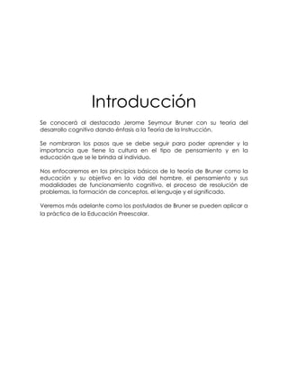 El documento presenta la teoría del desarrollo cognitivo de Jerome Bruner, enfocándose en la instrucción. Bruner propuso que la enseñanza debe ajustarse al nivel de desarrollo de los estudiantes y que los conceptos deben enseñarse primero a través de la acción, luego de forma icónica y finalmente de manera simbólica. También destacó el papel del andamiaje del profesor y la necesidad de un currículo en espiral que retoma periódicamente los mismos temas con mayor prof