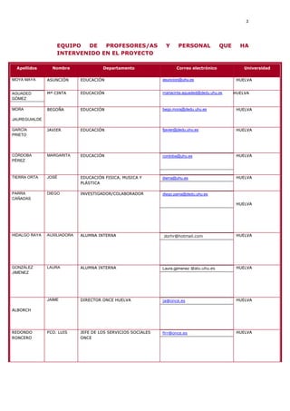 Este documento describe un proyecto de innovación docente cuyo objetivo es crear y aplicar material didáctico y tecnológico para la inclusión de ciegos y discapacitados visuales en la formación de profesores de primaria, infantil, educación especial, educación física, psicopedagogía y un master en educación especial. El proyecto busca enseñar a los profesionales a elaborar su propio material que cumpla con los requisitos para ser utilizado por invidentes y discapacitados visuales, benef