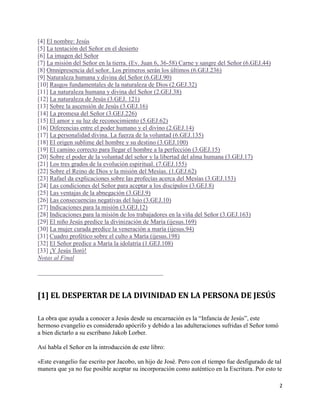 Este documento presenta una recopilación de temas relacionados con Jesús según las revelaciones de Jakob Lorber y Gottfried Mayerhofer. Incluye el despertar de la divinidad en Jesús, su tentación en el desierto, su naturaleza humana y divina, su misión en la tierra, y su promesa. También cubre temas como la idolatría a María y las condiciones para ser discípulo de Jesús. El epílogo describe cómo Jesús vivió desde los 12 a los 30 años, luchando contra la tentación mediante la p