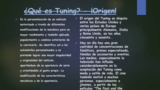 Este documento describe el origen y áreas principales de modificación del tuning. El tuning involucra la personalización de vehículos a través de modificaciones mecánicas y estéticas para mejorar el rendimiento y singularidad del vehículo. Se originó en los años 1950-1960 en Estados Unidos y Europa, especialmente Alemania, Italia y Reino Unido. Las áreas comunes de modificación incluyen el audio, interiores, motor y ruedas.