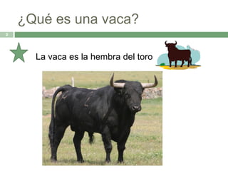 El documento resume las características básicas de las vacas. Describe que son mamíferos que producen leche y que tienen cuatro patas, cuernos y cola. Explica que su sonido es el mugido y que comen hierba. También habla sobre las razas de vaca, donde viven y los productos que ofrecen como la leche, la carne y la piel.