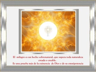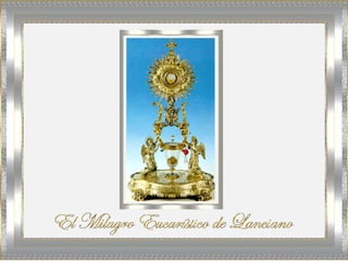 El documento describe el milagro eucarístico de Lanciano, Italia, donde en el año 700 un monje que dudaba de la presencia real de Cristo en la Eucaristía vio que la hostia se convirtió en carne y el vino en sangre durante la misa. Análisis científicos realizados en los siglos posteriores han demostrado que la carne es músculo cardiaco humano y la sangre es sangre humana del grupo sanguíneo AB, lo que constituye un fenómeno inexplicable.