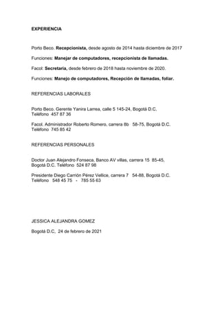 La hoja de vida presenta los datos personales, estudios, experiencia laboral y referencias de Jessica Alejandra Gómez. Detalla que es soltera, nació en Bogotá en 1995 y completó estudios técnicos en administración e inglés. Tuvo experiencia como recepcionista en Porto Beco de 2014 a 2017 y como secretaria en Facol de 2018 a 2020. Proporciona referencias laborales de sus empleadores y personales como el doctor Juan Alejandro Fonseca y el presidente Diego Carrión Pérez.