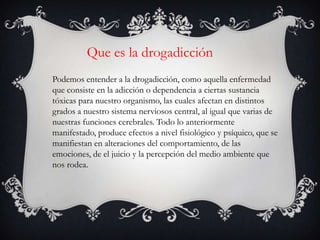 Este documento describe diferentes tipos de drogas, incluyendo el alcoholismo, la cocaína, la nicotina, la marihuana, el Ritalin y las anfetaminas. Explica que el alcoholismo es una enfermedad causada por la dependencia al alcohol, con síntomas de abstinencia cuando no se consume. También cubre los tratamientos para el alcoholismo, como la desintoxicación y terapias conductuales y farmacológicas.