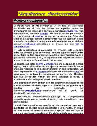 El documento describe tres investigaciones sobre la arquitectura cliente-servidor. Resume los conceptos clave como la distribución de tareas entre clientes y servidores, con los clientes haciendo peticiones a los servidores. Explica que la arquitectura separa las responsabilidades lógicamente aunque no necesariamente físicamente. Además, describe el flujo básico de información entre clientes y servidores.