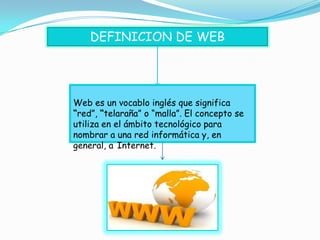 El documento define las diferentes generaciones de la Web. La Web 1.0 permitió a las empresas publicar información y realizar transacciones en línea. La Web 2.0 se centró en las redes sociales y la capacidad de los usuarios para generar y compartir contenido. La Web 3.0 hace hincapié en el análisis semántico de la información producida por los usuarios. Finalmente, la Web 4.0 permitirá que personas y objetos se conecten de forma inalámbrica en cualquier lugar del mundo físico o virtual.