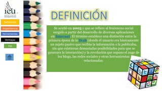 El documento define la web 2.0 como un fenómeno social surgido del desarrollo de aplicaciones en Internet que permite la interacción entre usuarios. Explica que herramientas como blogs y redes sociales permiten compartir y producir contenido entre usuarios. También destaca las ventajas de las nuevas tecnologías educativas como abrir espacios de comunicación, fomentar el aprendizaje colaborativo y permitir continuar el aprendizaje fuera del aula.