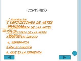 Las artes gráficas se refieren a la creación y elaboración de diseños visuales para su impresión. Su historia se remonta a la prehistoria cuando el hombre descubrió cómo transferir dibujos. A lo largo de la historia se han desarrollado diferentes técnicas como la xilografía, litografía e imprenta, permitiendo reproducir textos e imágenes de forma masiva. Las artes gráficas han evolucionado gracias a innovaciones que permiten su uso en diversos campos como la publicidad y la educación.