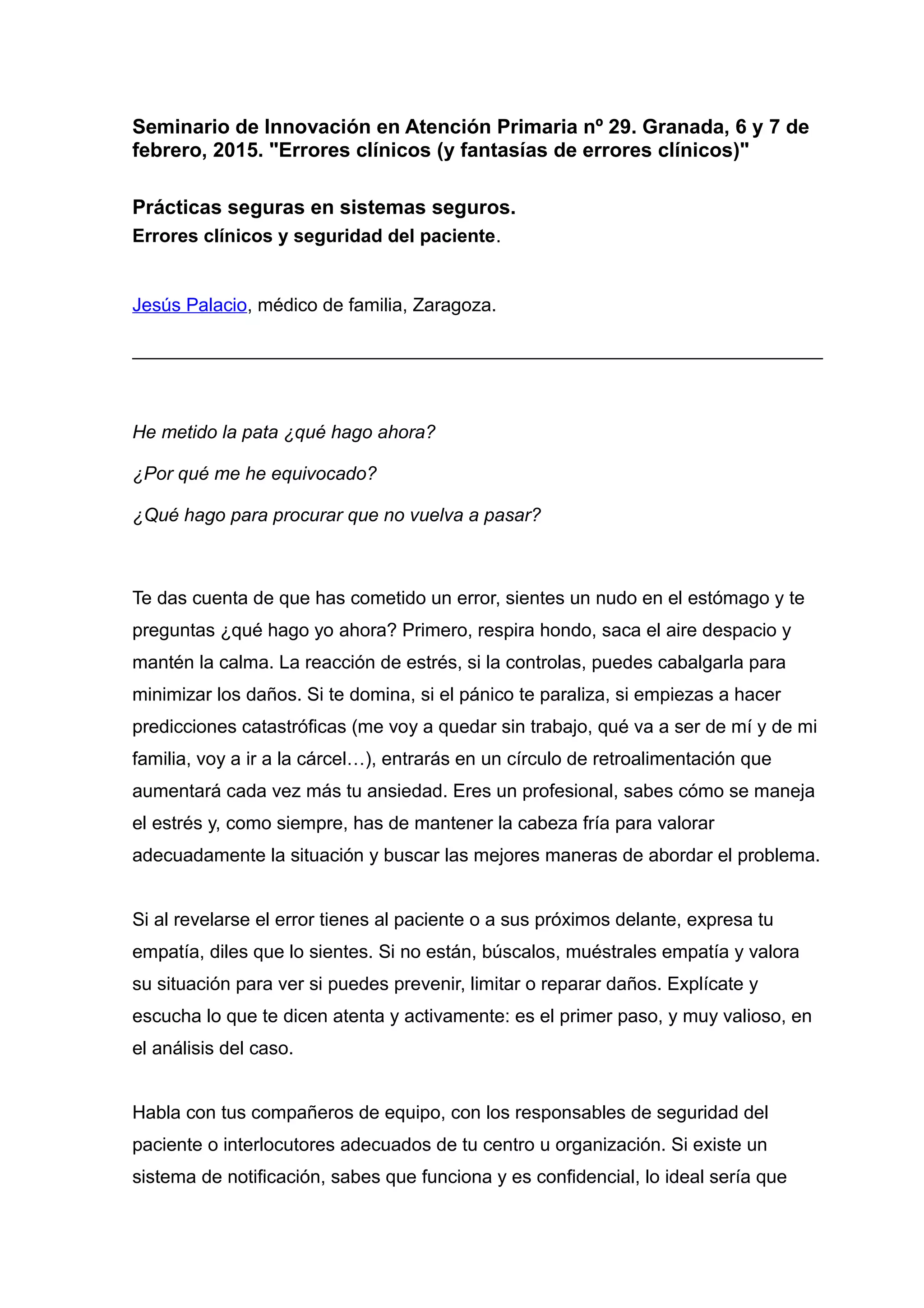 Este documento proporciona consejos para manejar errores clínicos y promover la seguridad del paciente. Recomienda mantener la calma, expresar empatía con el paciente, notificar el error a compañeros y responsables de seguridad, analizar las causas sistémicas del error y buscar oportunidades de mejora. El objetivo no es encontrar culpables sino prevenir futuros errores mediante prácticas seguras en sistemas seguros que maximicen los beneficios y minimicen los daños para los pacientes.