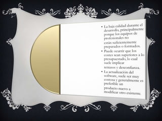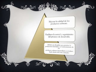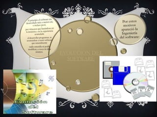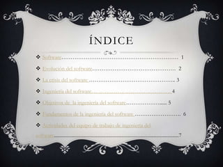 Este documento presenta información sobre software e ingeniería del software. Explica brevemente qué es el software, su evolución y la crisis del software. Luego introduce la ingeniería del software, sus objetivos, fundamentos y las actividades clave del equipo de desarrollo de software. Finalmente, resume diferentes modelos del ciclo de vida del software como el modelo en cascada, modelos evolutivos, modelo en espiral e incremental.