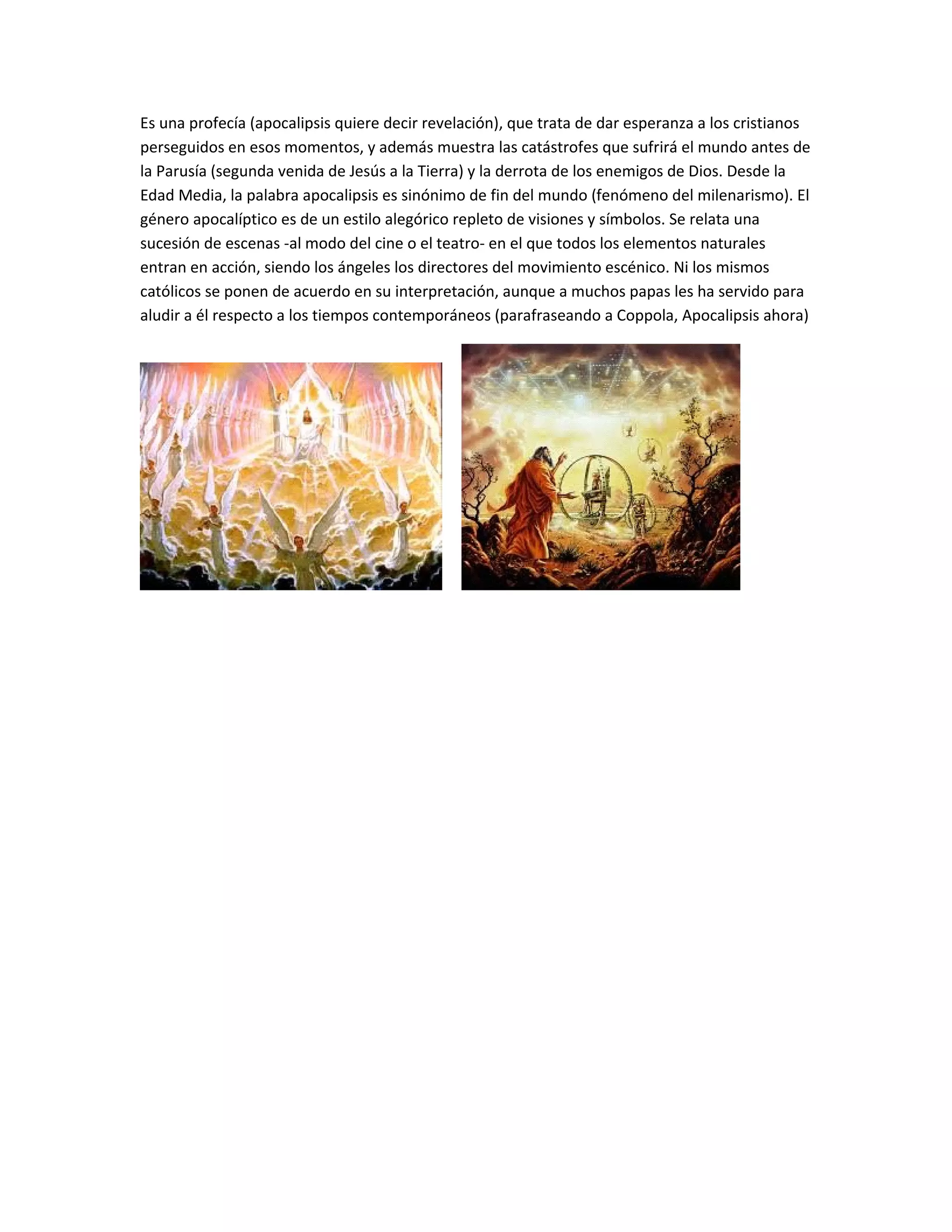 El documento resume el libro bíblico del Apocalipsis, explicando que es una profecía que tenía como objetivo dar esperanza a los cristianos perseguidos y describir las catástrofes que ocurrirían antes de la segunda venida de Jesús. También señala que desde la Edad Media la palabra apocalipsis se asocia con el fin del mundo y que el género apocalíptico se caracteriza por el uso de visiones y símbolos alegóricos para describir escenas como en una película donde los ángeles dirigen los eventos natural