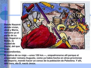 El documento resume la historia de Jesús desde su nacimiento en Belén hasta su crucifixión y resurrección. Jesús nació en Belén y fue reconocido por pastores y magos como el Mesías esperado. Vivió 30 años en Nazaret y comenzó su ministerio público después de ser bautizado por Juan Bautista. Jesús predicó sobre el amor de Dios y eligió a doce apóstoles para continuar su mensaje. Realizó milagros y enseñó a la gente a vivir como hijos de Dios. Los líderes religiosos judíos se