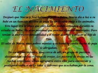 Jesús nació en Belén en un humilde pesebre. Los pastores fueron avisados de su nacimiento por un ángel. Jesús creció en Nazaret y a los doce años discutió con los doctores en el templo. Comenzó su ministerio a los treinta años y predicó el amor, el perdón y la salvación. Fue crucificado pero resucitó a los tres días, fundando así el cristianismo.