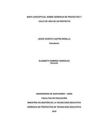 Este documento presenta un mapa conceptual sobre la gerencia de proyectos y el ciclo de vida de un proyecto. El mapa muestra que la gerencia de proyectos se basa en las necesidades de expansión, desarrollo y adecuación de una organización, y se divide en tres fases: inicial, intermedia y final. Además, identifica los principales roles involucrados en un proyecto como el director, cliente, personal, equipo y patrocinador.