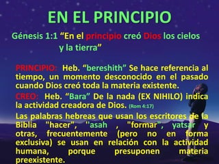 1) Génesis 1:1 establece que Dios creó los cielos y la tierra, indicando que toda la materia existente fue creada por Dios de la nada. 2) Juan 1:1-3 y Colosenses 1:15-17 afirman que Jesucristo, como el Verbo, fue el agente a través del cual Dios creó todas las cosas. 3) Los milagros de Jesús como cambiar el agua en vino y multiplicar
