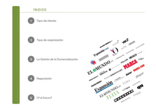 Este documento resume la presentación de Jesús Zaballa, director comercial de Unidad Editorial, sobre la comercialización de la prensa. Describe los diferentes tipos de clientes, formas de organizar la estructura comercial, y cómo gestionar la comercialización de manera activa e innovadora. También analiza la negociación con anunciantes y prevé que la lectura en el futuro estará cada vez más digitalizada a través de plataformas como Orbyt.