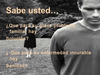 El documento habla sobre Jesucristo y cómo él puede ofrecer soluciones a los problemas familiares y enfermedades incurables, romper cadenas como el alcoholismo y la cárcel, y ofrecer salvación, perdón de pecados y vida eterna. Jesucristo ama al lector y quiere que venga a él para descansar y salvarse solo a través de él.