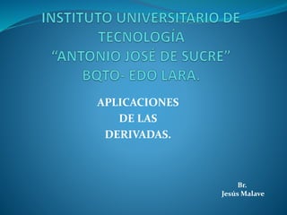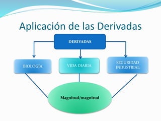 El documento describe tres aplicaciones de las derivadas: en biología para modelar el crecimiento bacteriano, en la vida cotidiana aunque no especifica ejemplos, y en la seguridad industrial aunque tampoco proporciona detalles. Brinda una introducción general sobre el tema de las aplicaciones de las derivadas en diferentes campos sin profundizar en ninguno.