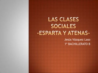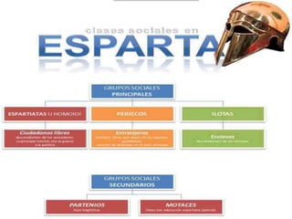 El documento describe la organización social de Esparta y Atenas en la antigua Grecia. En Esparta, la sociedad se dividía en espartanos (ciudadanos con plenos derechos), periecos (hombres libres sin derechos completos), hilotas (esclavos) y otros grupos menores. En Atenas, los ciudadanos tenían derechos y responsabilidades militares, políticas y judiciales, mientras que los metecos (extranjeros) y esclavos carecían de derechos de ciudadanía.