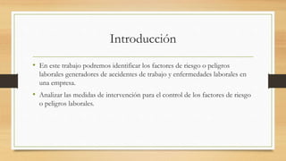 El documento identifica los factores de riesgo laborales que pueden causar accidentes y enfermedades en el trabajo, destacando peligros como trabajar en alturas, altas temperaturas y el uso de energías peligrosas. Se analizan medidas de intervención para mitigar estos riesgos, como la señalización adecuada y el uso de equipos de protección personal. También se abordan problemas relacionados con la iluminación, exceso de jornada laboral y el uso de pantallas de datos, resaltando la importancia de una gestión adecuada para mejorar la seguridad laboral.