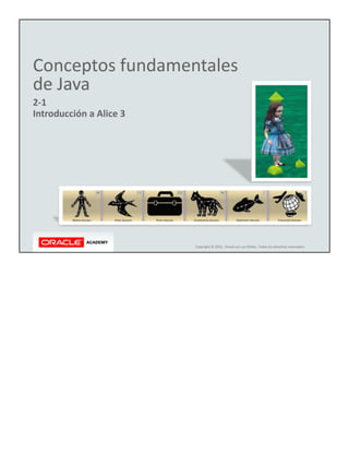 Este documento proporciona instrucciones sobre cómo usar el entorno de programación Alice. Explica cómo agregar objetos al mundo, familiarizarse con los editores de escena y código, y acceder a las herramientas y galerías de objetos. También cubre temas como guardar el trabajo con frecuencia, arrastrar instrucciones de programación al editor de código, y probar el código mediante el cambio de valores de argumentos.