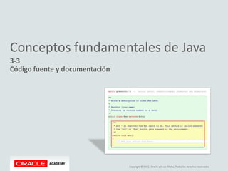 Este documento describe los conceptos fundamentales del código fuente y la documentación en Java. Explica los componentes del código fuente como la descripción de la clase, los métodos, los comentarios y la documentación. También cubre temas como invocar métodos, usar sentencias if, y mostrar la orientación de objetos mediante métodos.