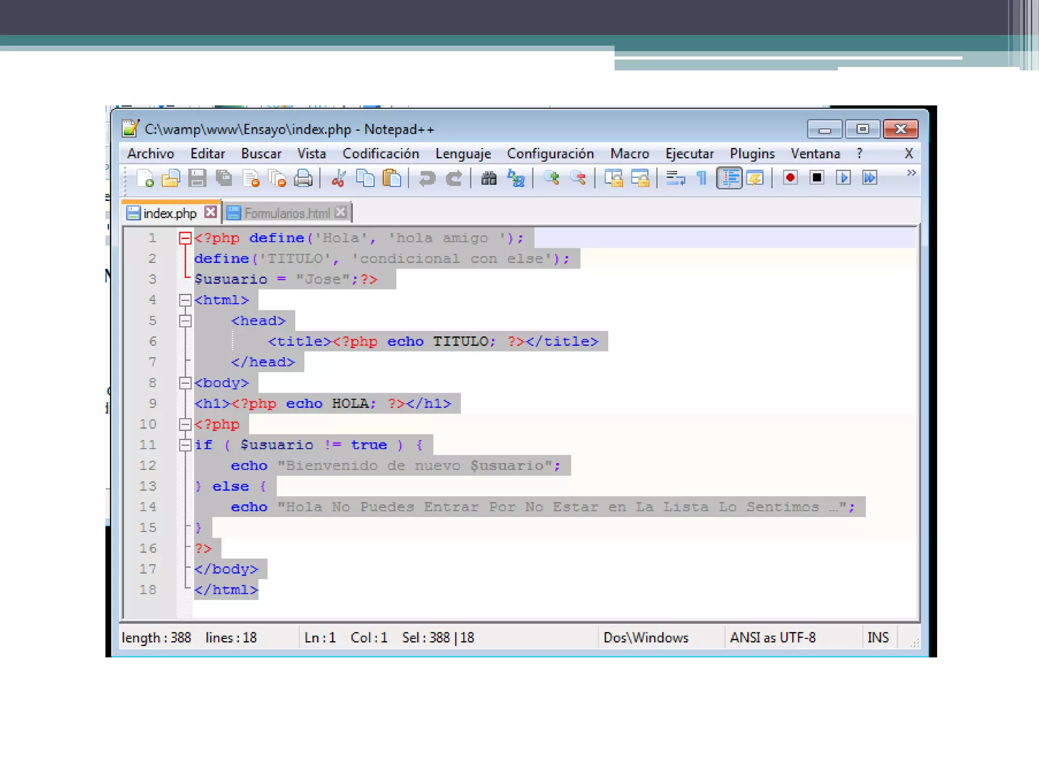El documento explica cómo configurar un entorno de desarrollo PHP utilizando WampServer y cómo escribir código PHP básico con constantes, variables, y estructuras condicionales if/else. Se declara PHP, se define el título y constantes, se establece una variable, y se muestra texto condicionalmente dependiendo del valor de la variable utilizando if y else.
