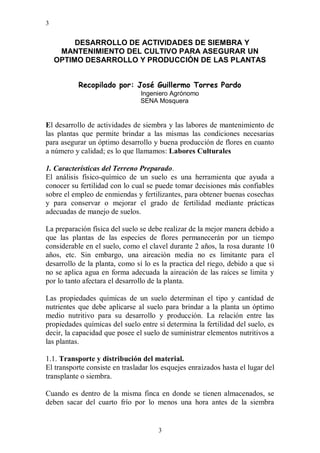 El documento describe las actividades de siembra y mantenimiento de cultivos necesarias para garantizar un óptimo desarrollo y producción de plantas. Estas incluyen la preparación del terreno, el transporte y distribución de esquejes, la identificación, clasificación y ubicación de variedades, y el marcado de camas para la siembra. El objetivo es brindar a las plantas las condiciones adecuadas para su crecimiento a través de prácticas como el análisis del suelo, la selección de esquejes y la