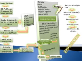 Este documento presenta los pasos para realizar un proyecto de investigación que incluye una lluvia de ideas. Detalla los objetivos generales y específicos, el marco teórico, el diseño de investigación y los instrumentos de recolección de datos como entrevistas y simulaciones. Luego describe el análisis de 30 problemas y 5 criterios para su valoración, con el fin de seleccionar el mejor proyecto para construir un artefacto tecnológico. Finalmente, explica los pasos finales de recolección de datos, exposición y