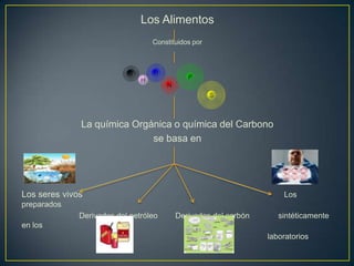 El documento habla sobre los alimentos, la nutrición y los nutrientes. Explica que los alimentos están constituidos principalmente por carbohidratos, proteínas y grasas, los cuales proporcionan energía y son necesarios para la construcción de moléculas y órganos en el cuerpo. También describe que la nutrición involucra los procesos por los cuales el cuerpo recibe, transforma y utiliza las sustancias químicas de los alimentos, requiriendo energía de los hidratos de carbono y las grasas, así como proteínas,