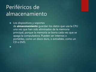 Este documento describe varios periféricos de almacenamiento y partes internas de una computadora. Explica dispositivos de almacenamiento como discos duros, unidades de disco flexible, CDs, DVDs y memorias USB. También describe tarjetas de sonido, puertos, procesadores, memoria RAM y otros componentes internos como la tarjeta madre y la BIOS.