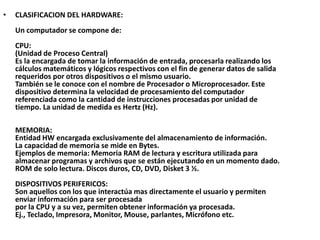 El documento define hardware como las partes tangibles de un sistema informático como componentes electrónicos, cables y periféricos. Explica que el hardware se clasifica en CPU (unidad central de procesamiento), memoria para almacenar información como RAM y ROM, y dispositivos periféricos como teclado, monitor e impresora que permiten la interacción del usuario con el sistema.