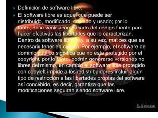 Este documento compara el software libre y el software propietario, detallando sus ventajas y desventajas. El software libre permite la modificación, copia y redistribución del código fuente, mientras que el software propietario restringe estos usos. Entre las ventajas del software libre se incluyen precios bajos o gratuitos y mayor seguridad, mientras que el software propietario ofrece interfaces más amigables y compatibilidad con hardware. Ambos tipos de software tienen fortalezas y debilidades.