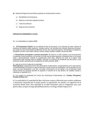 Este documento presenta preguntas de selección simple y verdadero/falso sobre la creatividad. Aborda temas como las definiciones de creatividad, los componentes y elementos centrales de la creatividad según diferentes autores, las características de la personalidad creativa y los factores del pensamiento creativo.