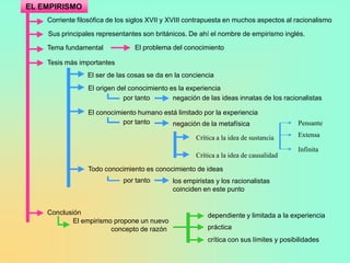 Este documento resume las principales ideas del empirismo como corriente filosófica de los siglos XVII y XVIII. El empirismo sostiene que todo conocimiento proviene de la experiencia y que las ideas no son innatas, sino que surgen a partir de la experiencia. Sus principales representantes fueron filósofos británicos como Thomas Hobbes, John Locke, George Berkeley y David Hume. El empirismo propone que la razón humana depende de los límites de la experiencia sensible.
